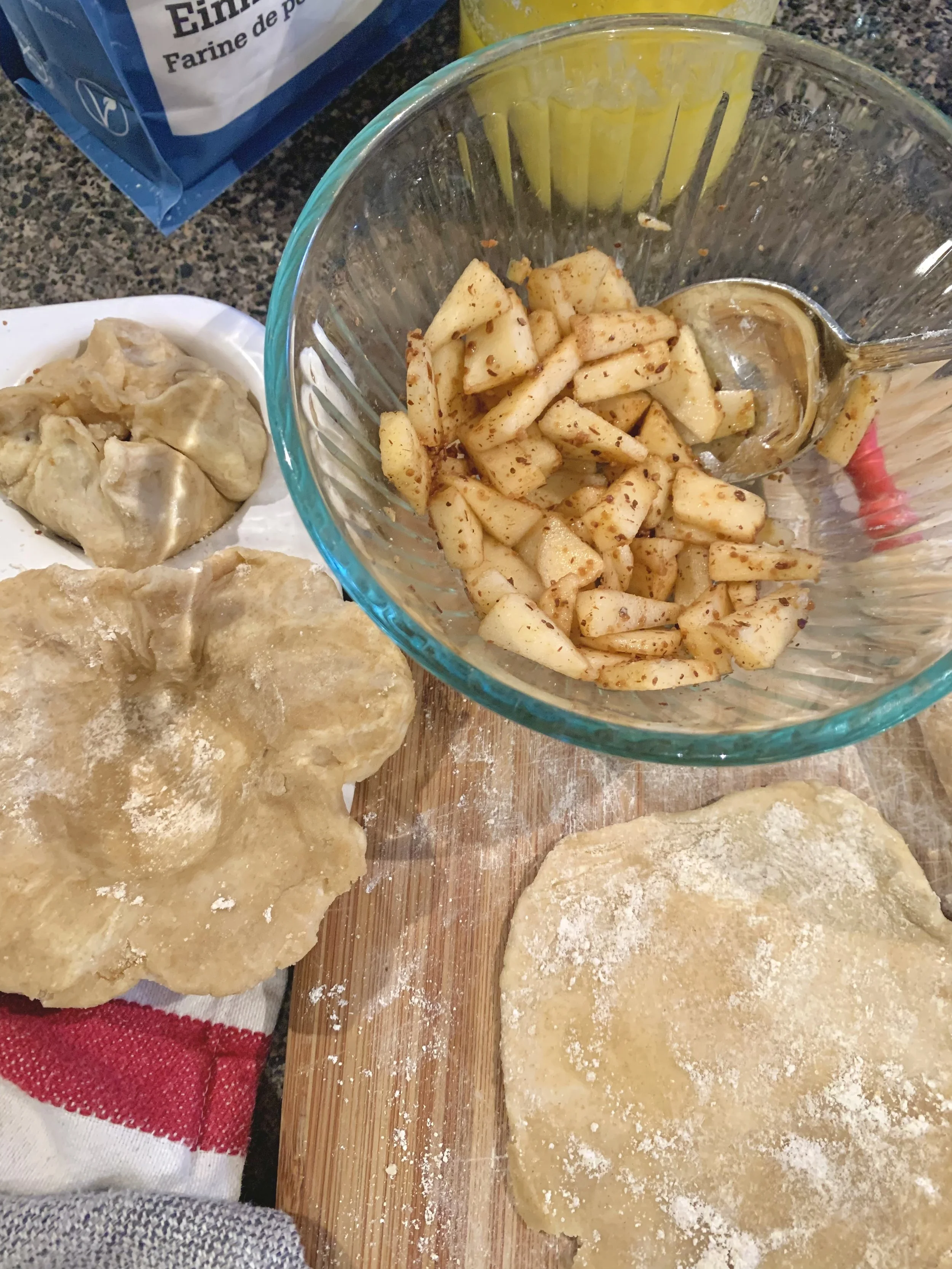 Putting it all together. Apples with fresh ground cinnamon and rolled out pieces of dough.