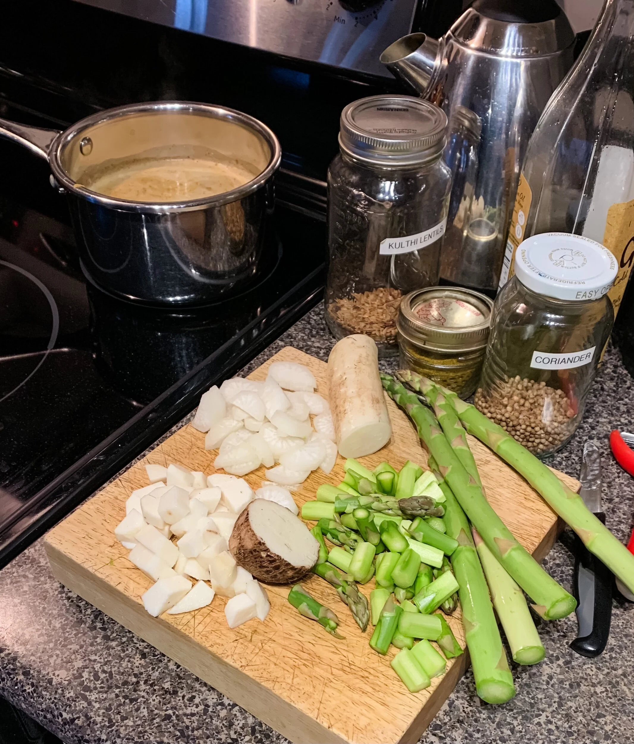 Asparagus Kulthi Lentil Soup with Taro and White Daikon Radish