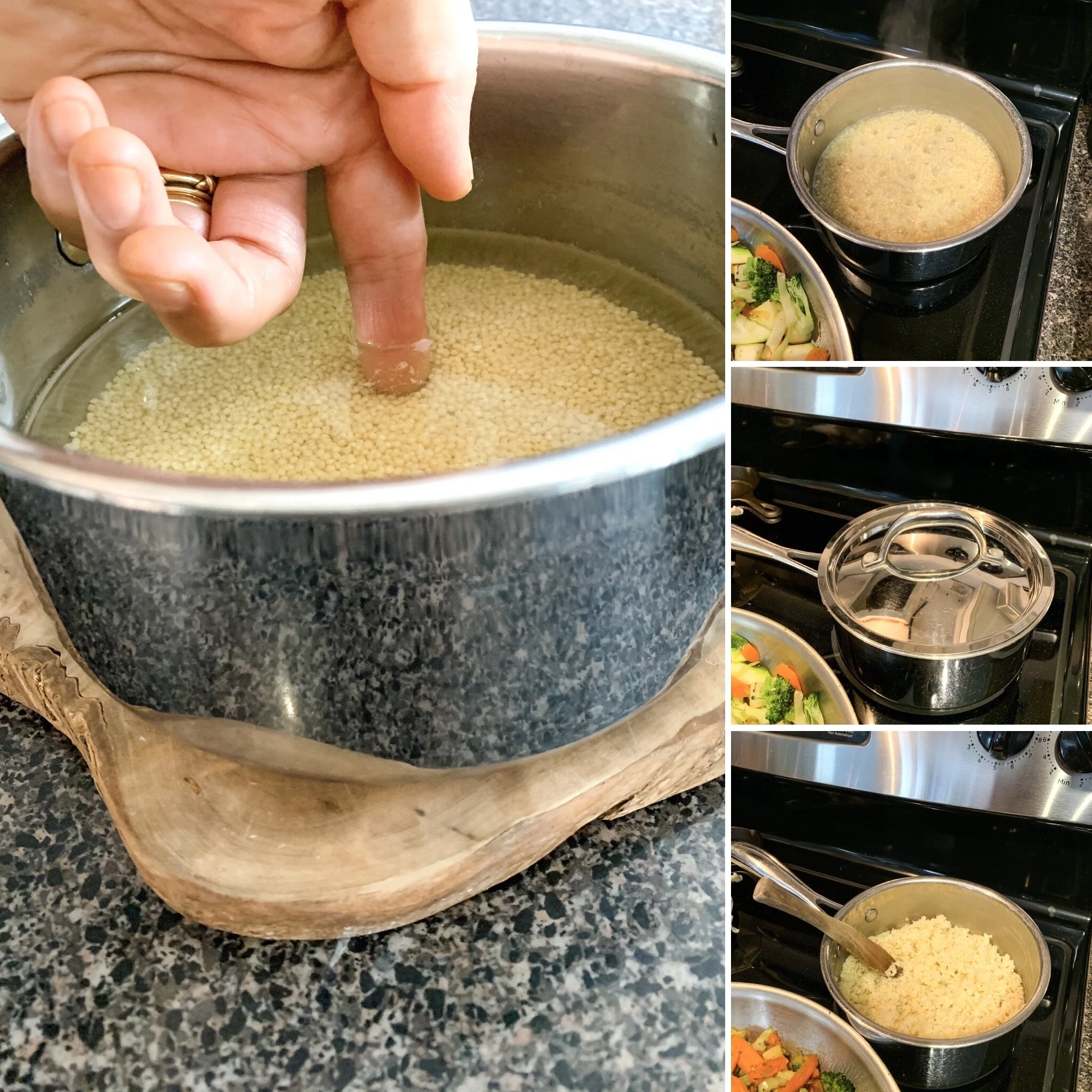 Cook millet- let millet and water come to a rolling boil in high heat for a few minutes. Cover with a lid, turn of stove and let steam for 20 minutes.