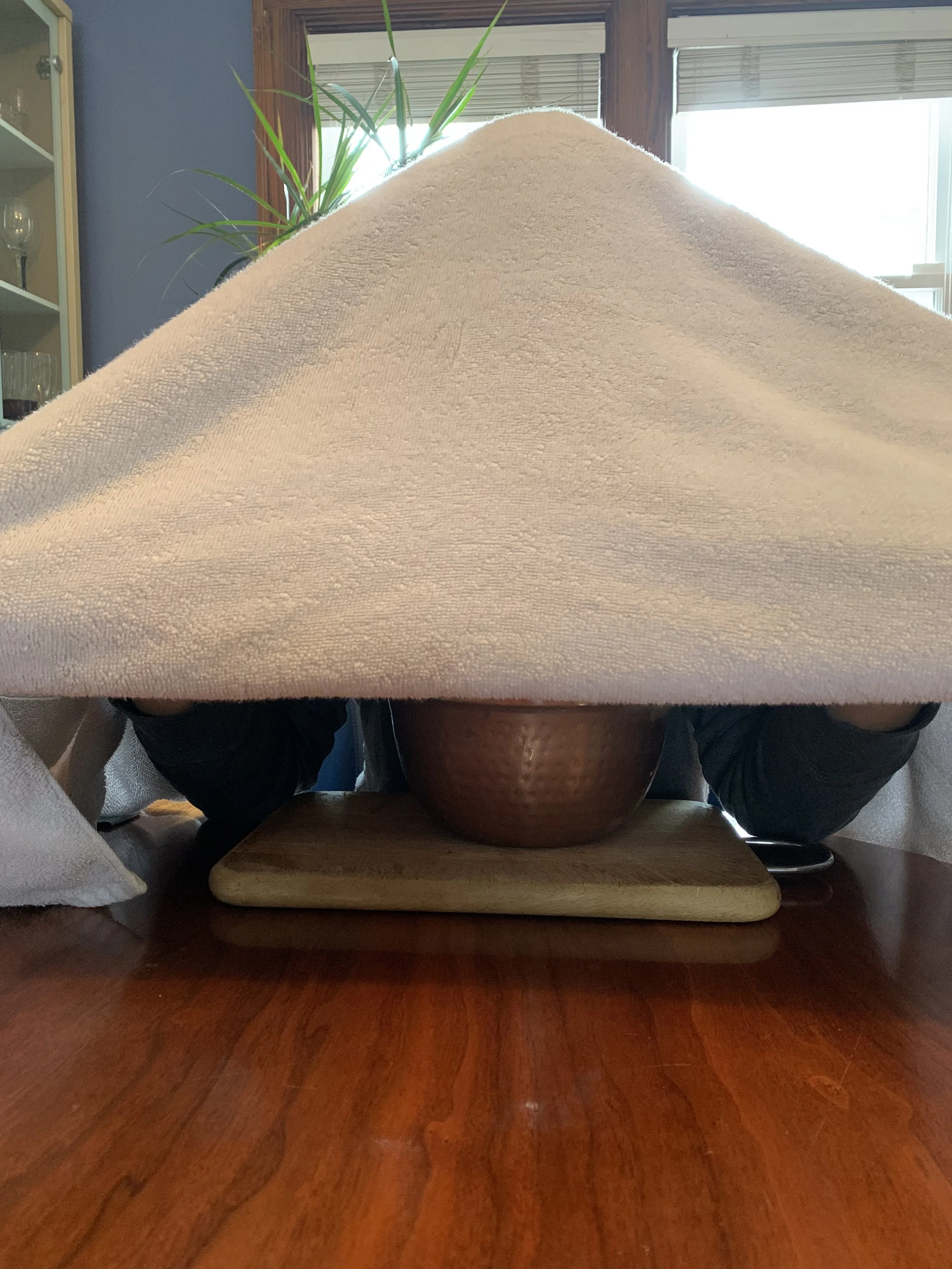 Close your eyes as you drape the large towel over your head, inhale, keeping a comfortable distance from the steam. Inhale steam for about 10-15 minutes.