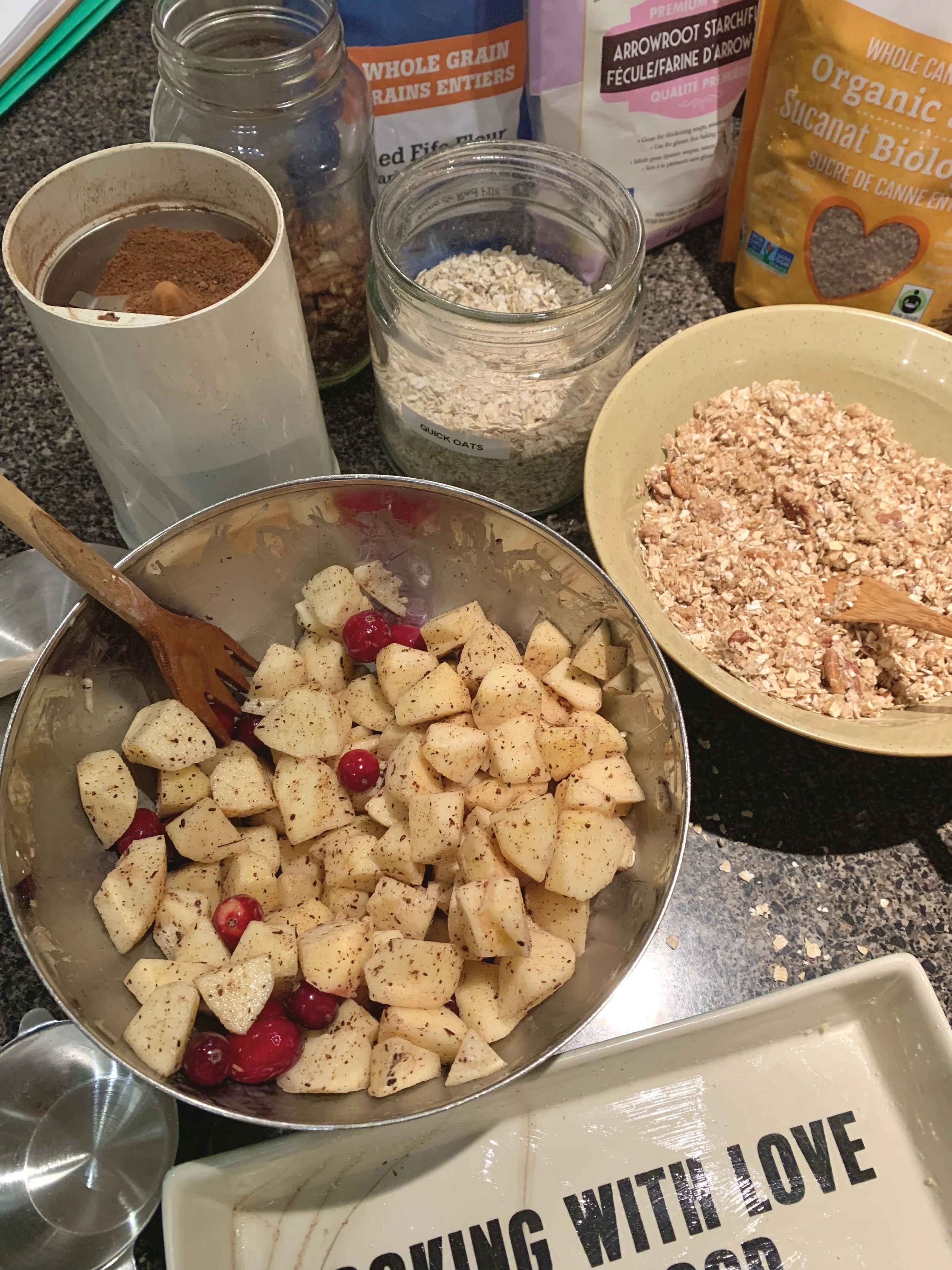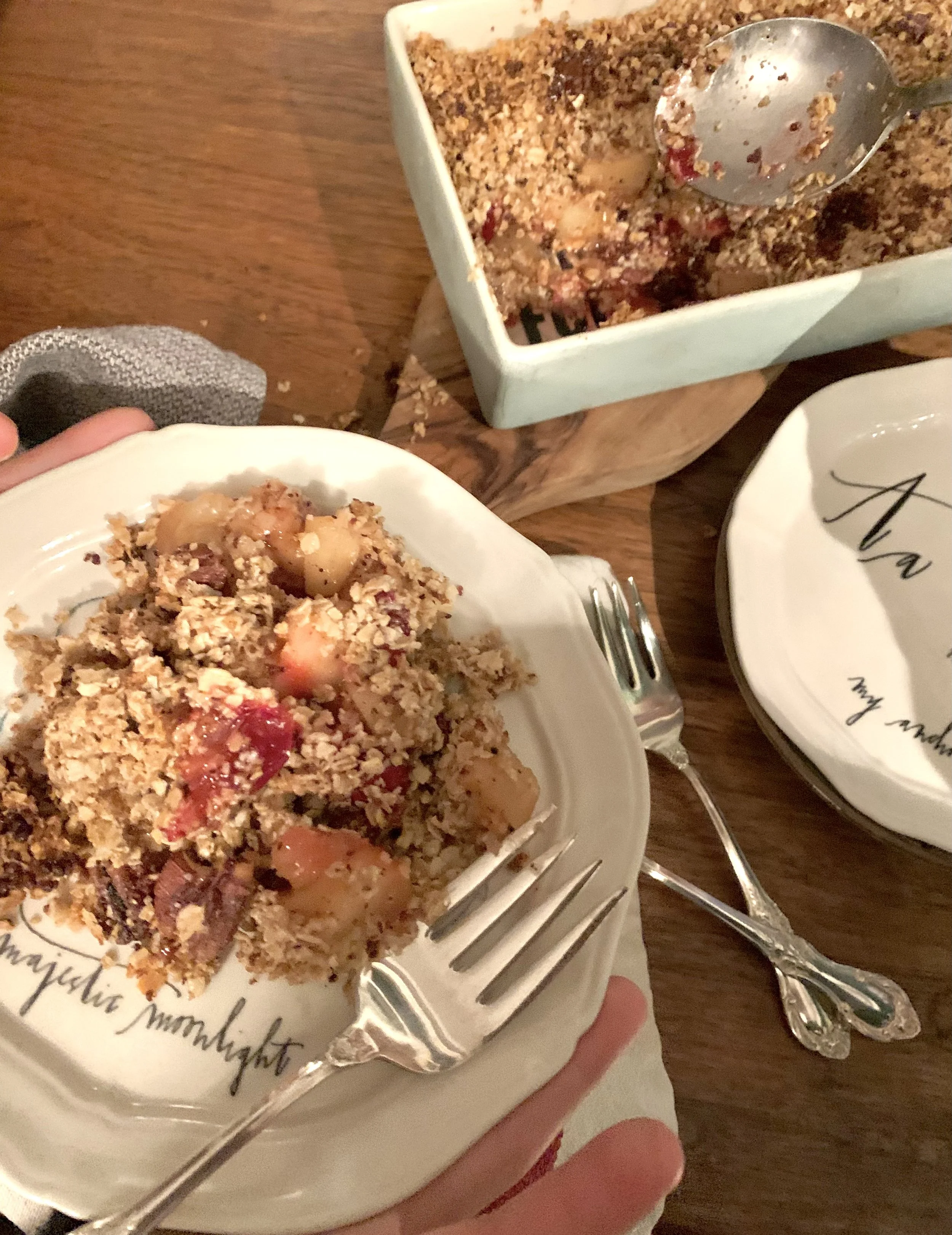 Since the start of fall, this easy to make apple crumble is the most requested sweet satisfaction in our home. This recipe calls for fresh cranberries, but you can leave it out, and add another apple. Double the recipe if you are expecting guests. They will love it!