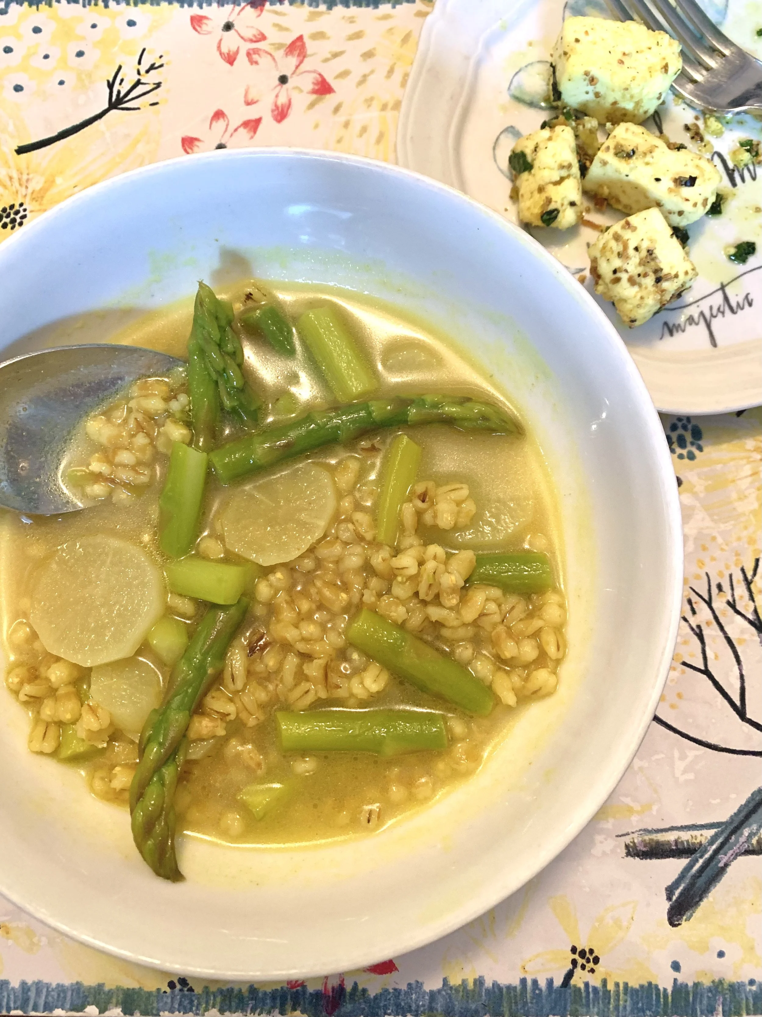 The simplest of meals are the ones where the ingredients are readily available, in season, fresh, inviting you to partake in nature’s offerings. Two spring vegetables currently offering their goodness are asparagus and radish. Enjoy this soup! It is simply delicious and amounts to a whole lot of goodness and great to have during cleansing seasons, spring and fall.