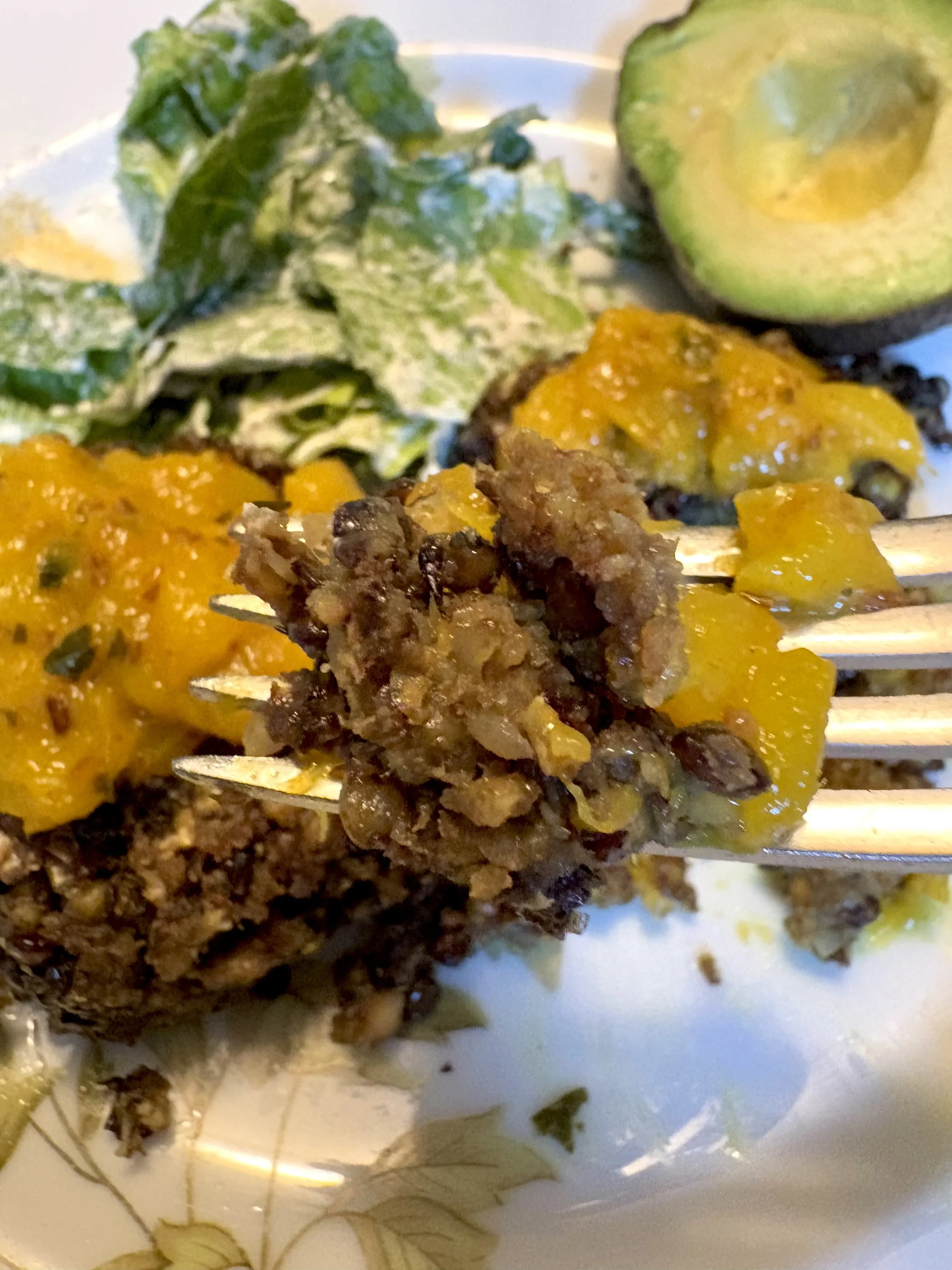 A hearty meal - Buckwheat Beluga Lentil Burger with Mango Curry Leaf Chutney, with a side Easy Vegan Caesar Salad and Avocado