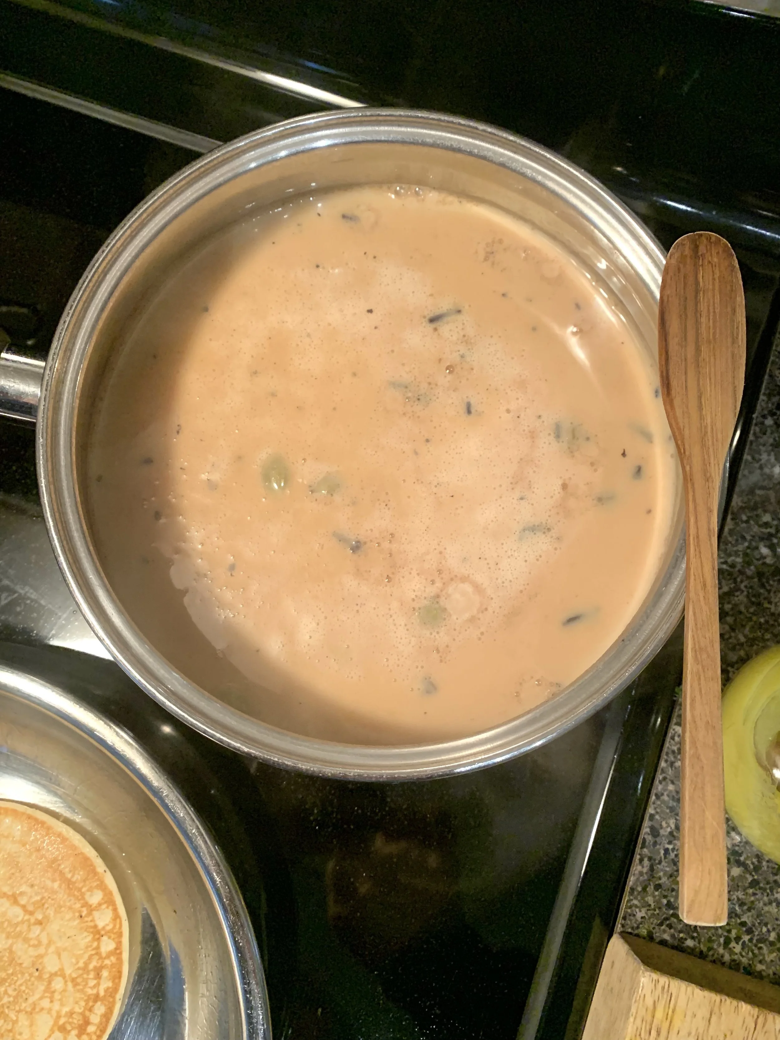Add tea and milk and let come to just a boil, then turn heat down to low, and cover with a lid. Let steep for 5 minutes.