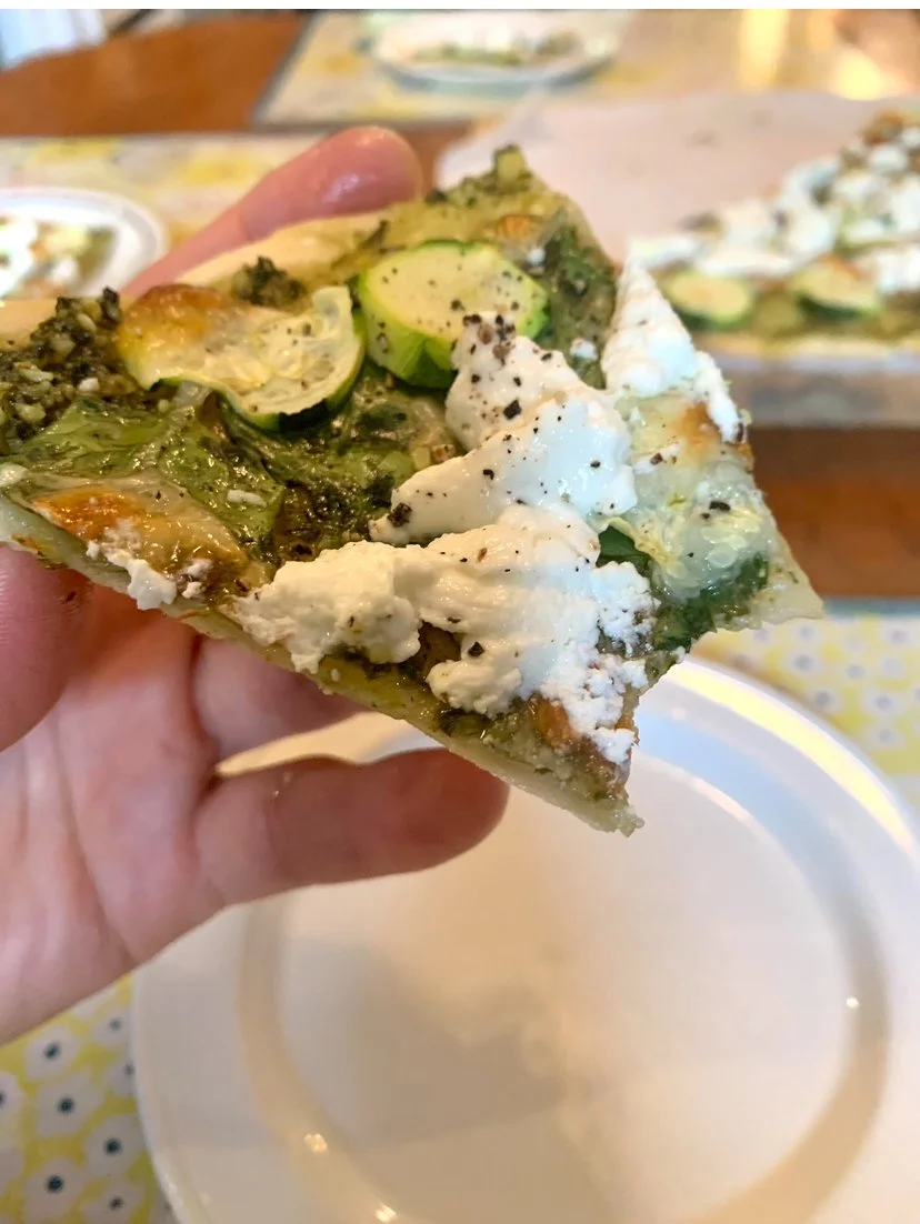 Chapati Pesto Pizza with Zucchini, Spinach and Goat Cheese, satisfying without making you feel bloated because there is no yeast in the dough which makes the bread rise. Yeast is bacteria that competes with your friendly gut bacteria, and too much yeast can cause bloating, gas, constipation, and other digestive issues.
