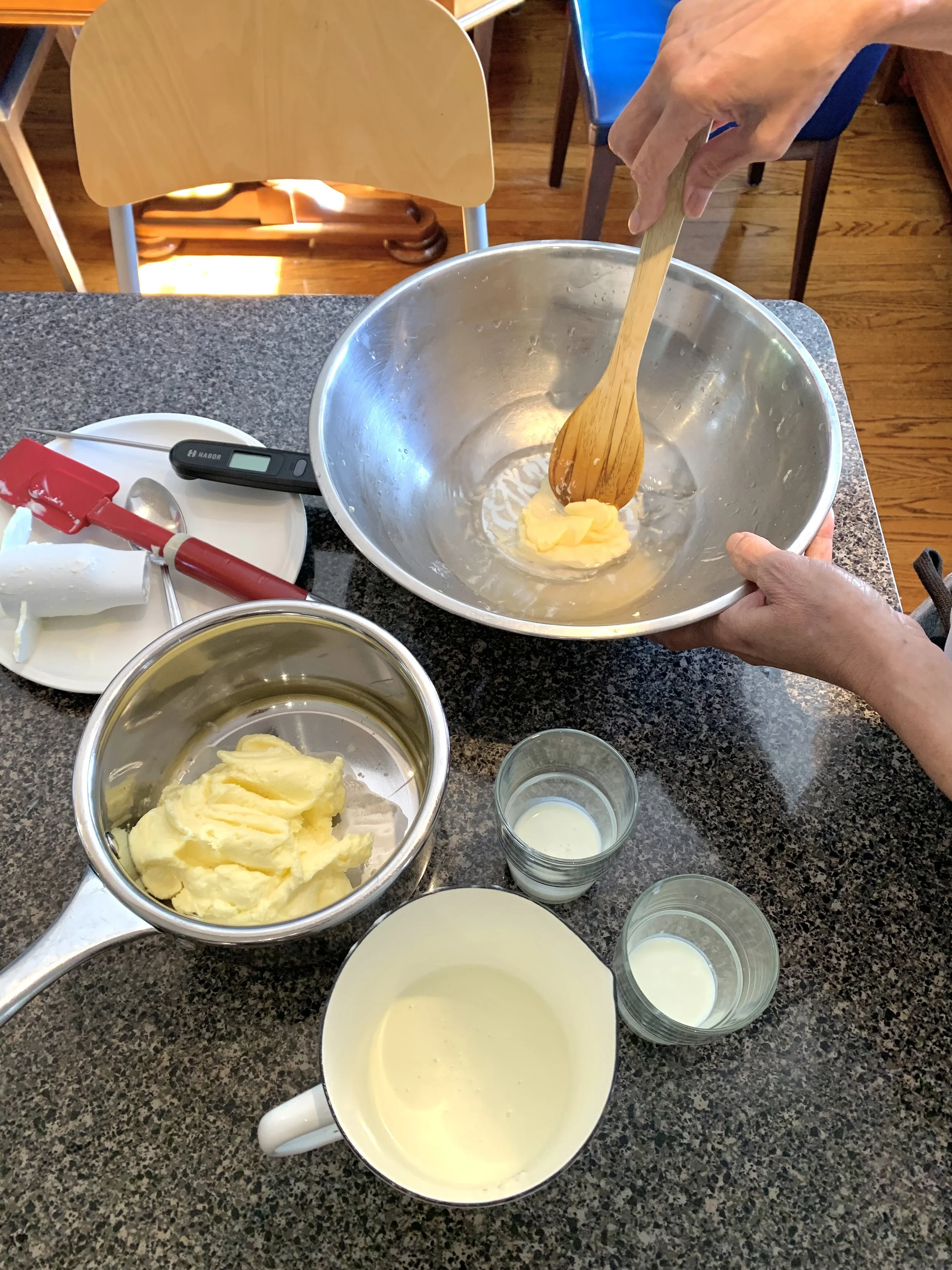 Fresh cultured butter and buttermilk. If you want to keep some of the cultured butter for use instead of making it into ghee, you will need to rinse the butter with water, as shown in this picture to allow the butter to stay fresh longer. It will take about 5-6 rinses with fresh water each time after a rinse to remove the buttermilk, which contains lactose and casein (milk protein). Look for the water to become clear, otherwise the butter will go rancid quicker when left out at room temperature.