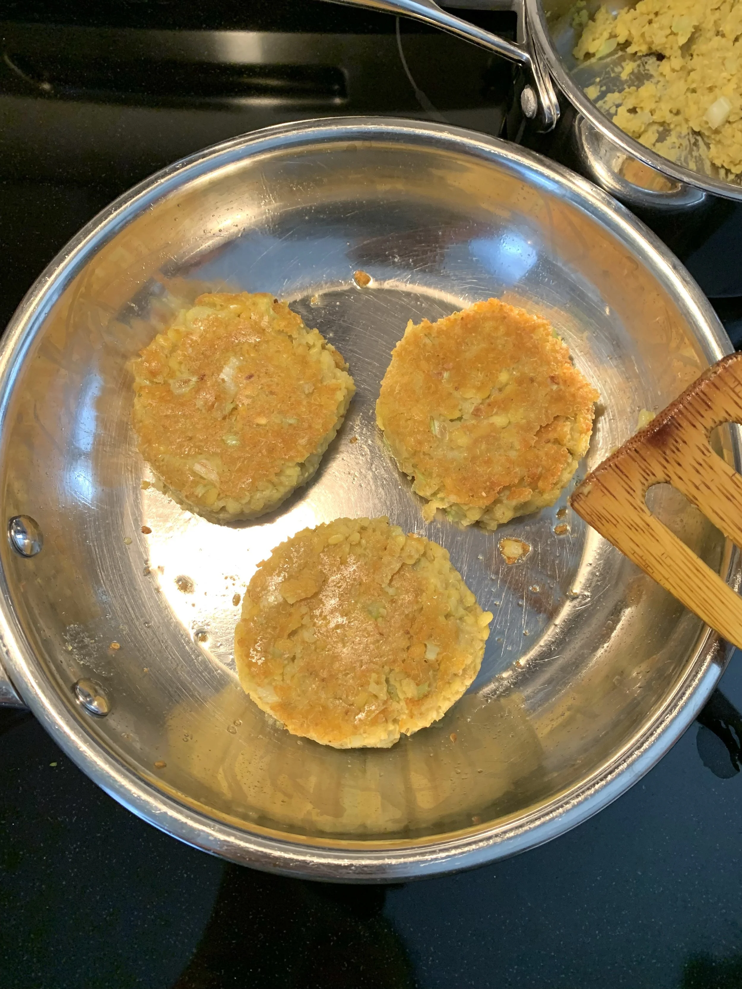 6. Form into patties and fry on medium heat with ghee or olive oil until golden brown on each side.