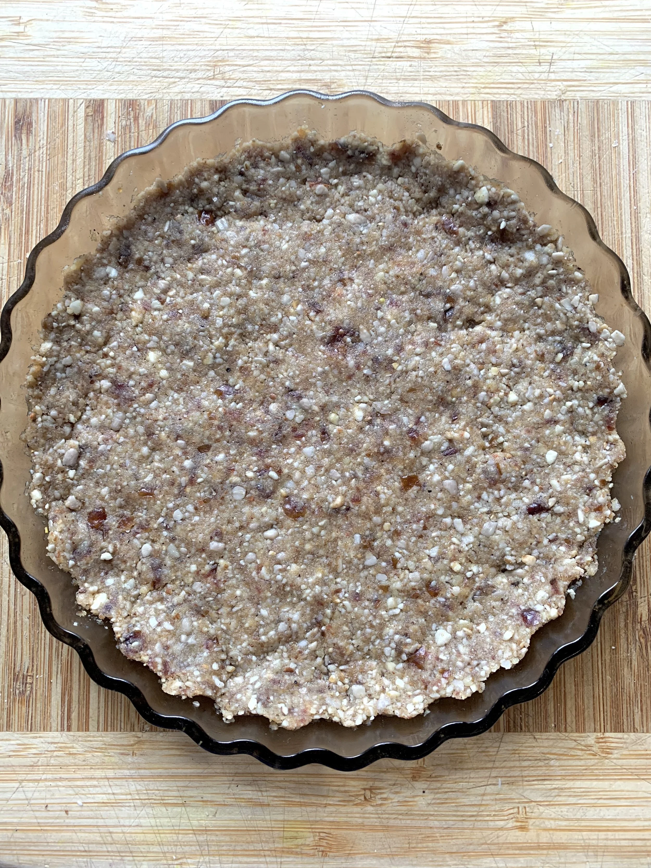 A quick and easy, nut crust held together with dates. Just grind some nuts and seeds in a spice or coffee grinder, add a couple of pitted dates and a bit of melted ghee or butter.
