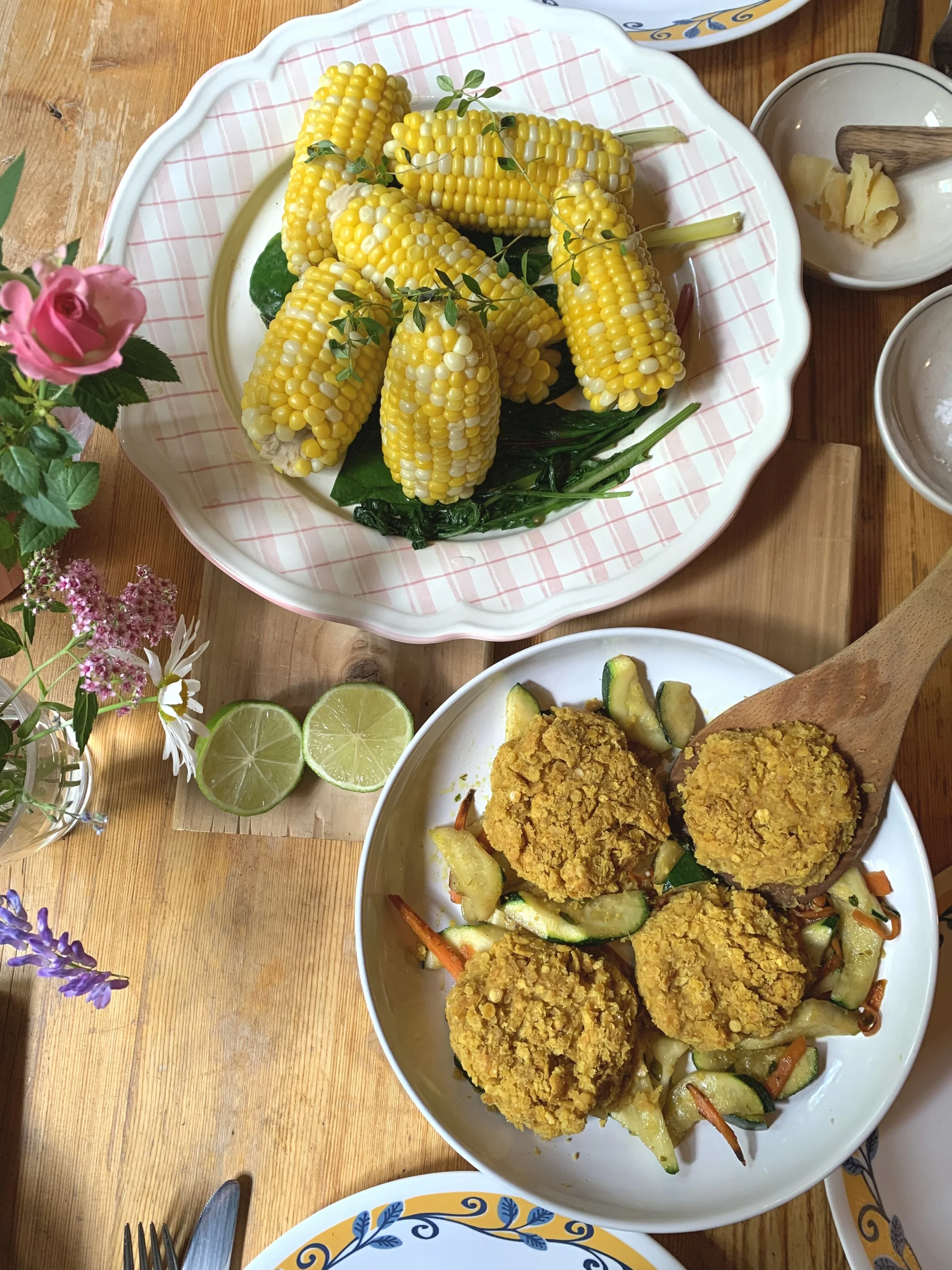 Vegetarian Burger served with Zucchini and Carrot Ribbons sautéed in Ghee and Thyme and Fresh Corn on a bed of Arugula and Beet Leaves wilted with Ghee