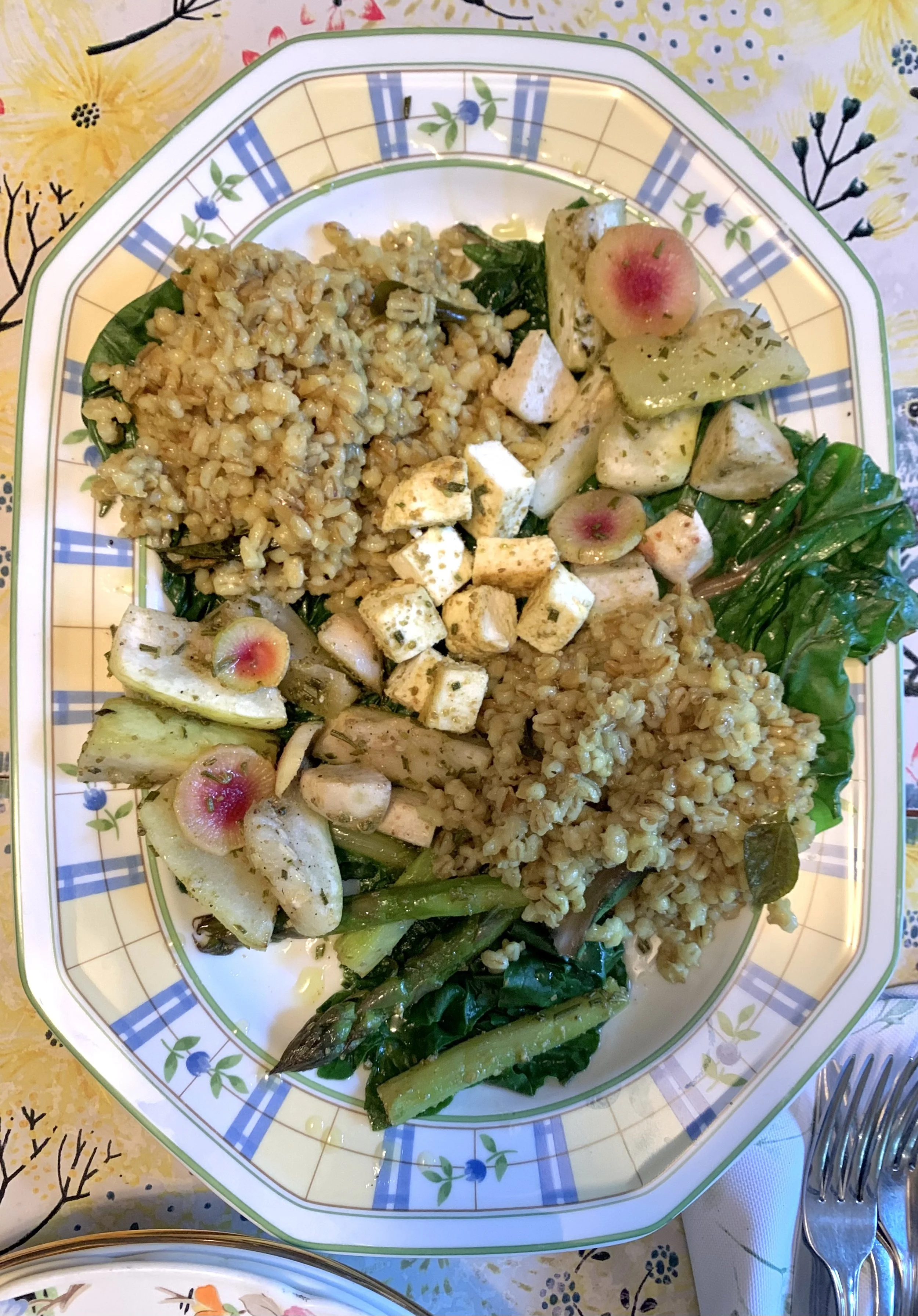 Spring Salad Platter with Barley, Asparagus, Taro, & Watermelon Radish